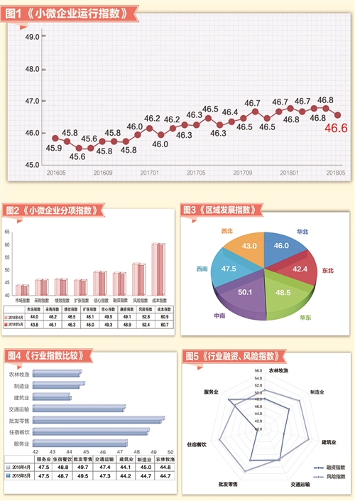 2018年5月份,“經濟日報-中國郵政儲蓄銀行小微企業運行指數”(見圖1)為46.6,較上月下降0.2個點,本月小微企業運行有所下滑。