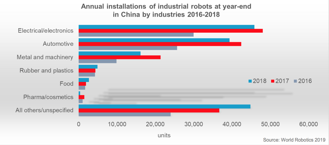 2016年-2018年,中國市場各行業(yè)的工業(yè)機器人年裝機量。電氣/電氣行業(yè)、汽車行業(yè)、金屬和機械工業(yè)始終是前三大應用行業(yè),但在2018年這三個行業(yè)的工業(yè)機器人裝機量均出現(xiàn)下滑。相反,其他行業(yè)則有所增長。