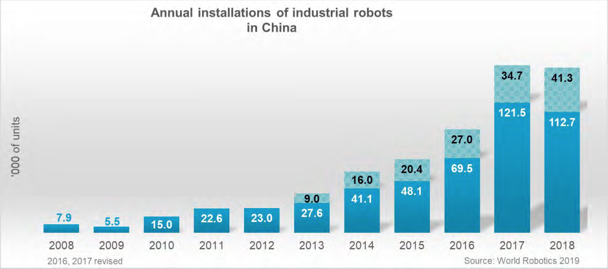 2008年-2018年中國市場工業(yè)機器人年裝機量,本文圖片均來自《全球機器人2019》報告