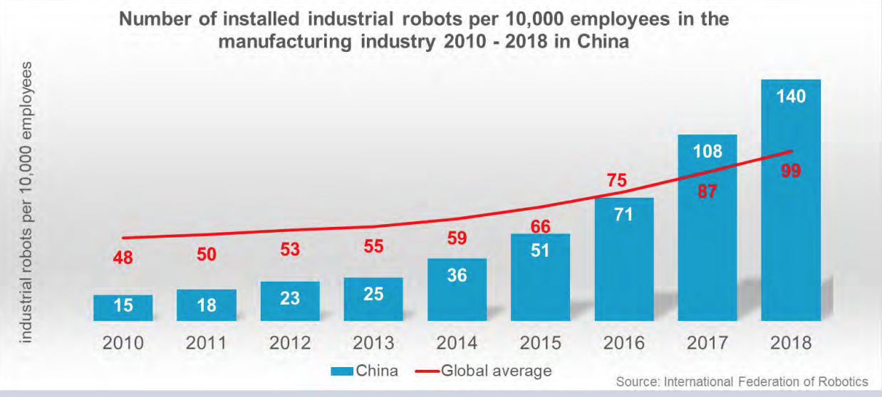 2018年,中國制造業(yè)工廠中的機器人密度(每萬名工人的機器人擁有量)是2010年的9.3倍,達到140。圖中藍柱為中國機器人密度,紅色曲線為全球平均水平