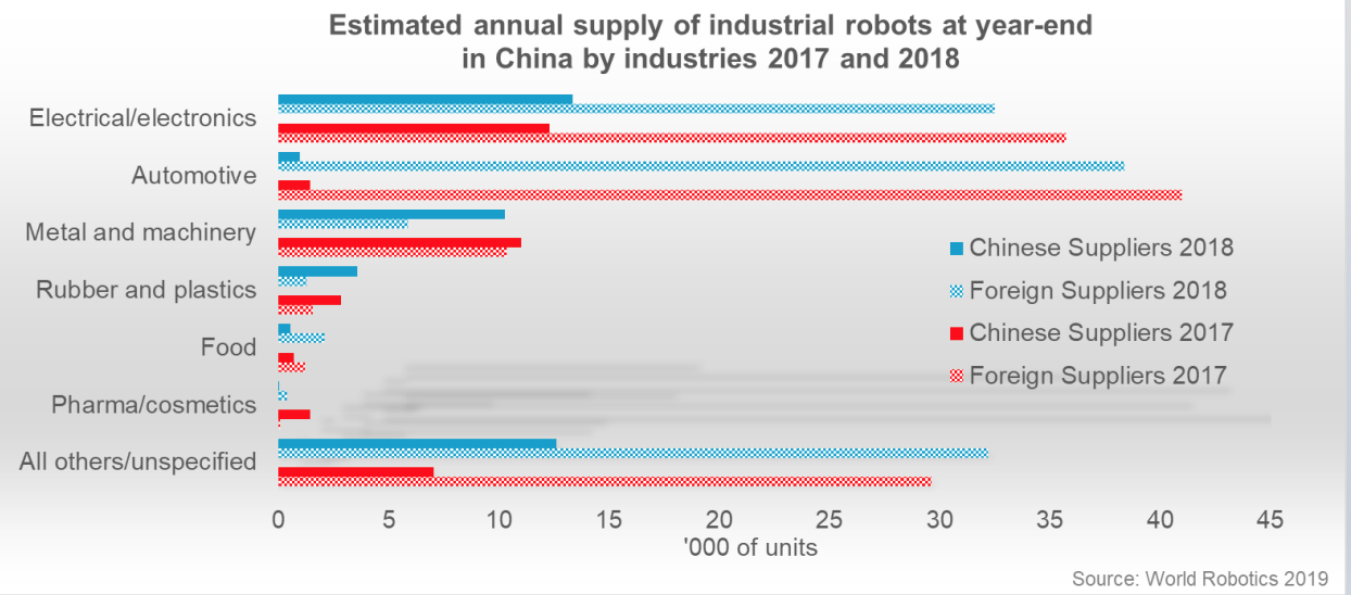 2018年,自主與外資品牌機器人分化明顯。中國本土機器人在國內(nèi)市場的總裝機量增加了5%(2018年:27%,2017年:22%),這說明中國鼓勵自主品牌機器人的政策導向帶來了成效。另一方面,受汽車行業(yè)不景氣影響,外資品牌的裝機量(包括非中國供應商在中國生產(chǎn)的產(chǎn)品)下降了7%,約為113000臺(2017年:約122000臺)。