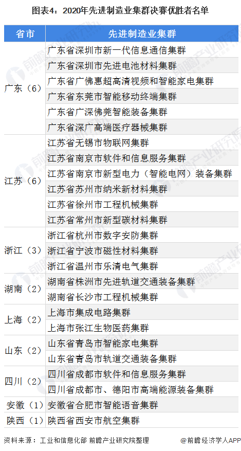 對于當前全國先進制造業發展現狀,為推動先進制造業集群發展,2021年3月,工業和信息化部發布2020年先進制造業集群決賽優勝者名單,其中廣東省和江蘇省先進制造業產業集群均為6個,數量并列全國第一,其次浙江省擁有三個,位居第三位。
