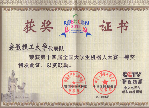 6月19日至21日,由共青團(tuán)中央學(xué)校部、全國(guó)學(xué)聯(lián)秘書處和中央電視臺(tái)新科動(dòng)漫頻道聯(lián)合主辦的第十四屆全國(guó)大學(xué)生機(jī)器人大賽(Robocon) 在孟子故里鄒城市體育館勝利閉幕。經(jīng)過(guò)小組循環(huán)制比賽和復(fù)賽、半決賽、決賽三天激烈比拼,我校大學(xué)生機(jī)器人協(xié)會(huì)一路過(guò)關(guān)斬將,力克國(guó)內(nèi)知名高校代表隊(duì),艱難闖進(jìn)8強(qiáng),勇奪大賽一等獎(jiǎng)和“最佳表現(xiàn)獎(jiǎng)”,作為安徽省唯一獲此殊榮的高校,為學(xué)校爭(zhēng)得了榮譽(yù),擴(kuò)大了學(xué)校的知名度和美譽(yù)度。